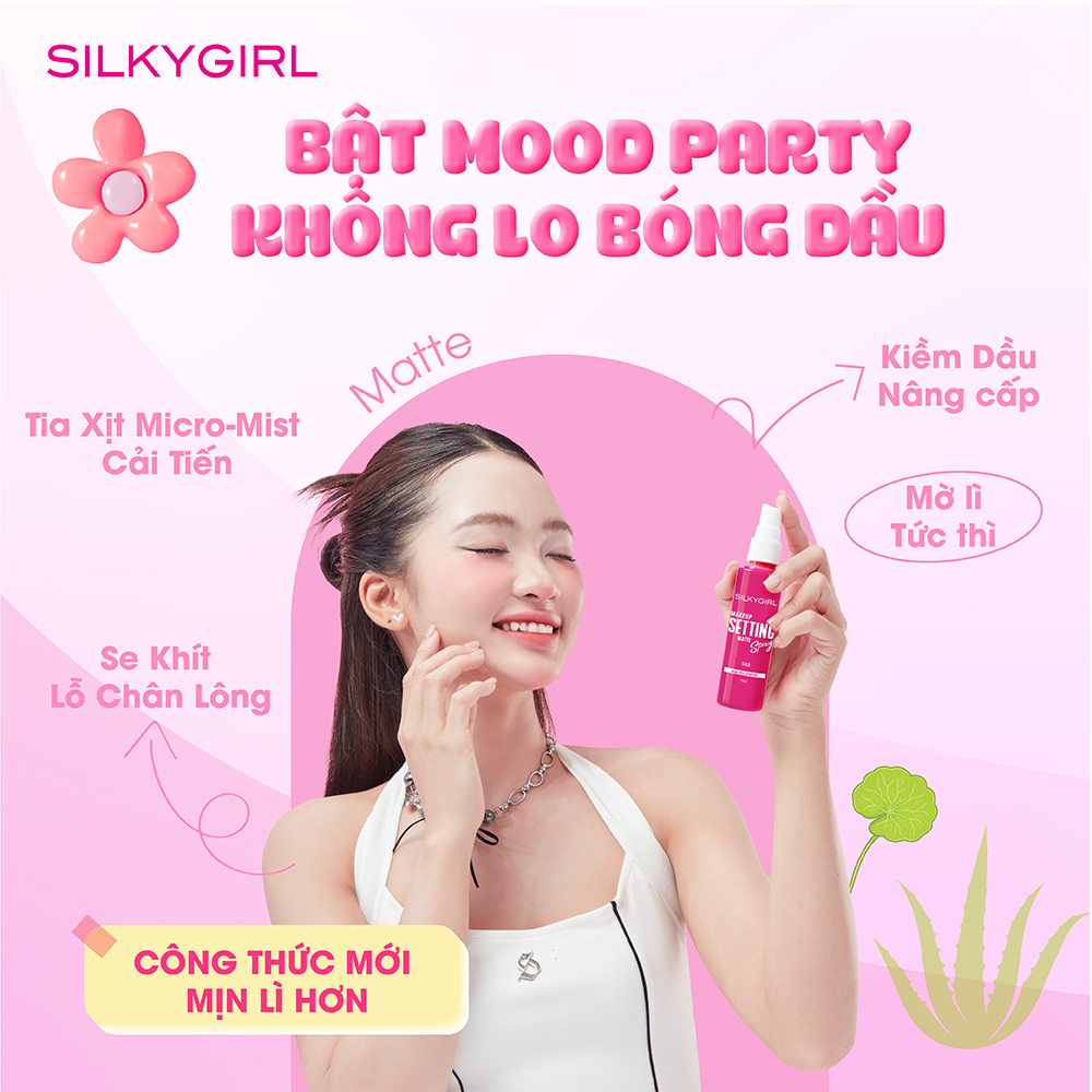 SILKYGIRL Makeup Setting Spray Matte là xịt khóa trang điểm đến từ thương hiệu Silkygirl của Malaysia, giúp giữ lớp makeup lâu trôi, mang lại hiệu ứng lì – không bóng dầu (matte & shine-free) suốt nhiều giờ. Sản phẩm có kết cấu nhẹ, tươi mát, giúp lớp nền trông tự nhiên, không nặng mặt hay bí da.